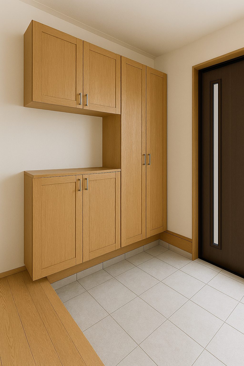 下駄箱や可動棚、トールタイプの収納を整えることで、靴や日用品がすっきり収まり、いつでも片づいた玄関を保てます。