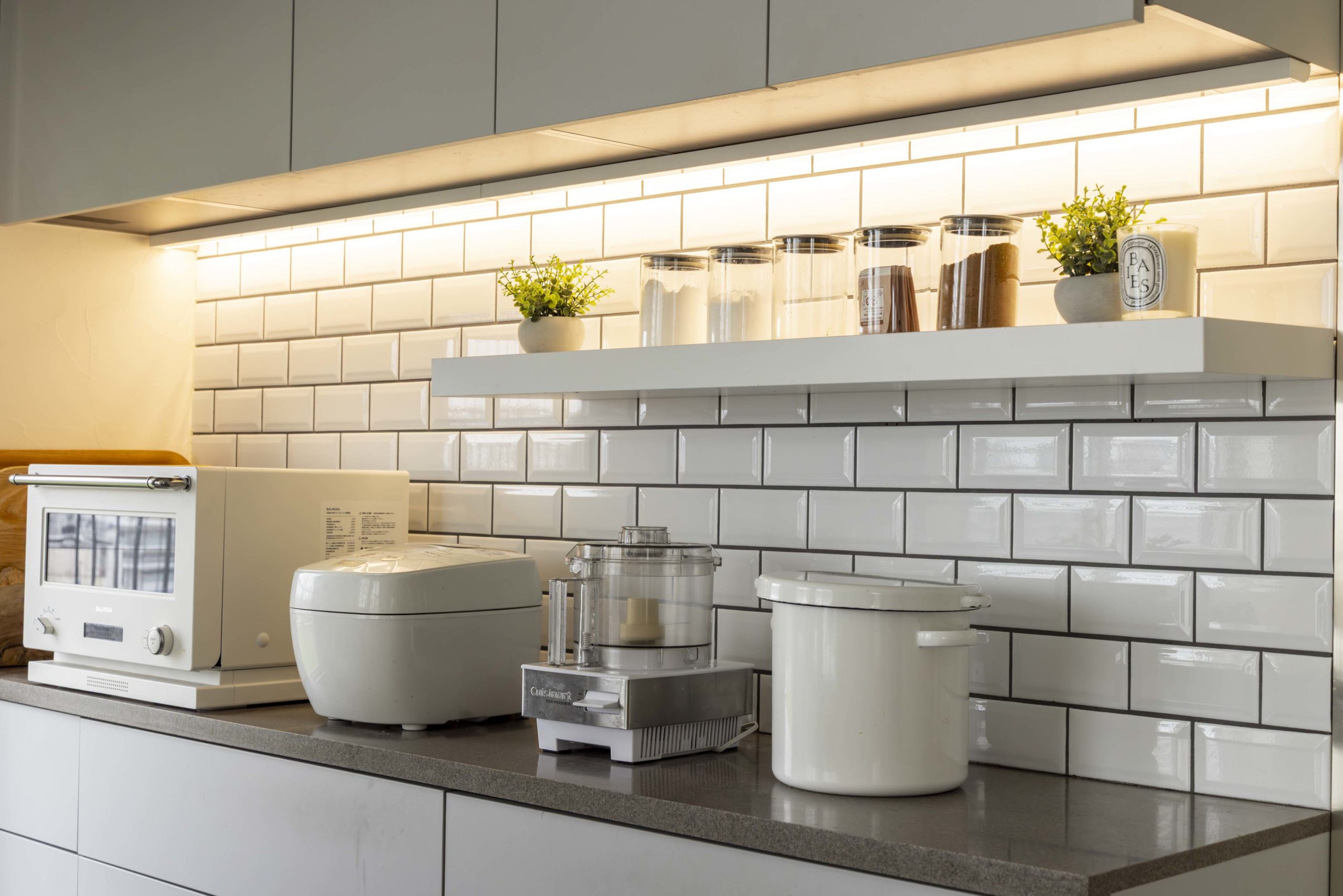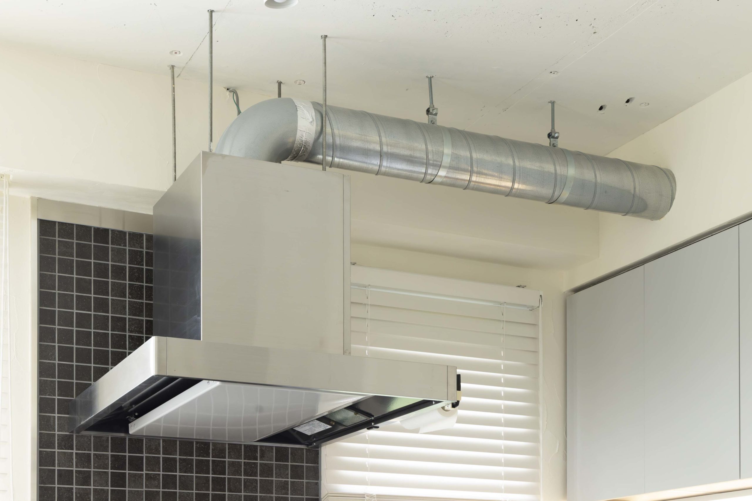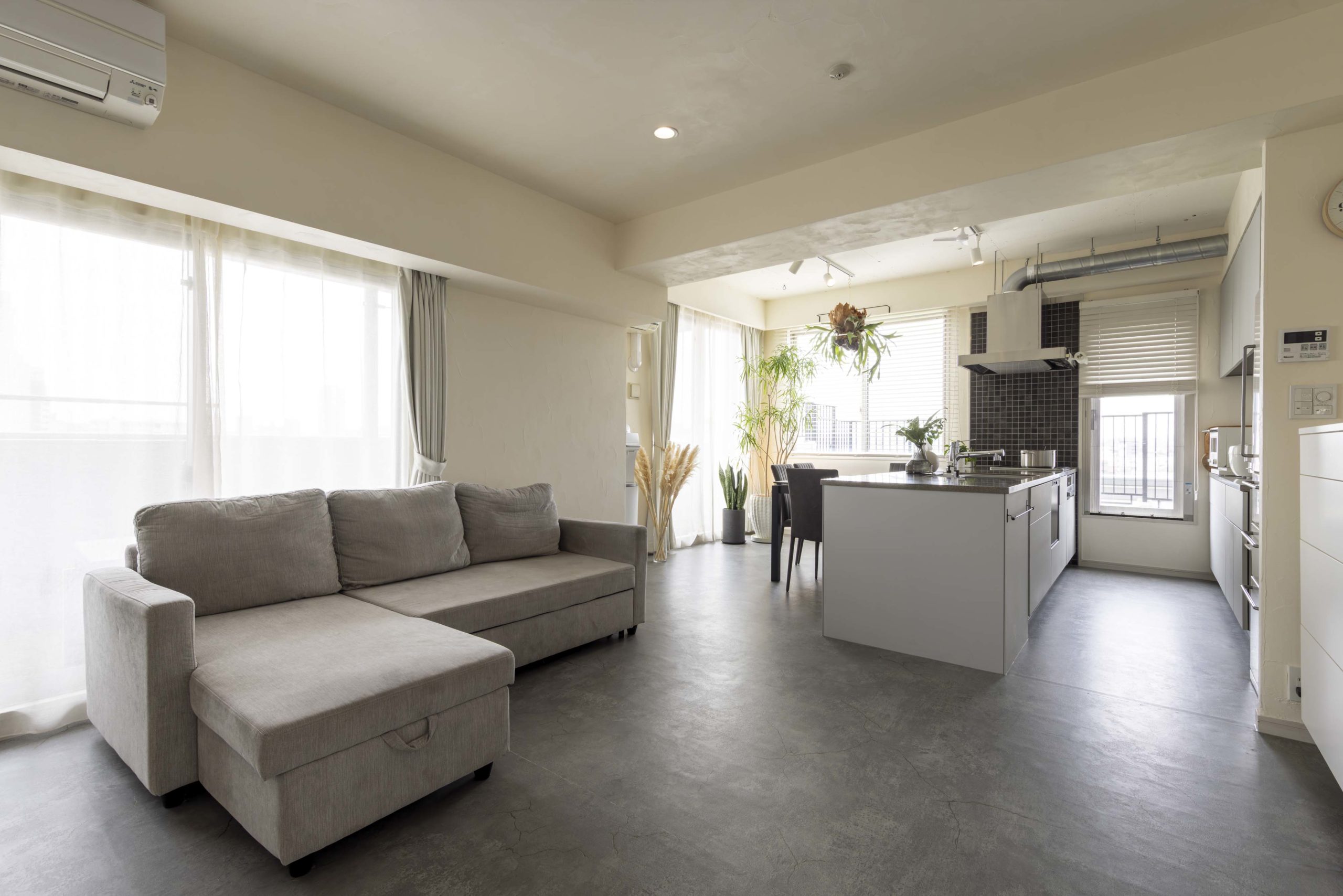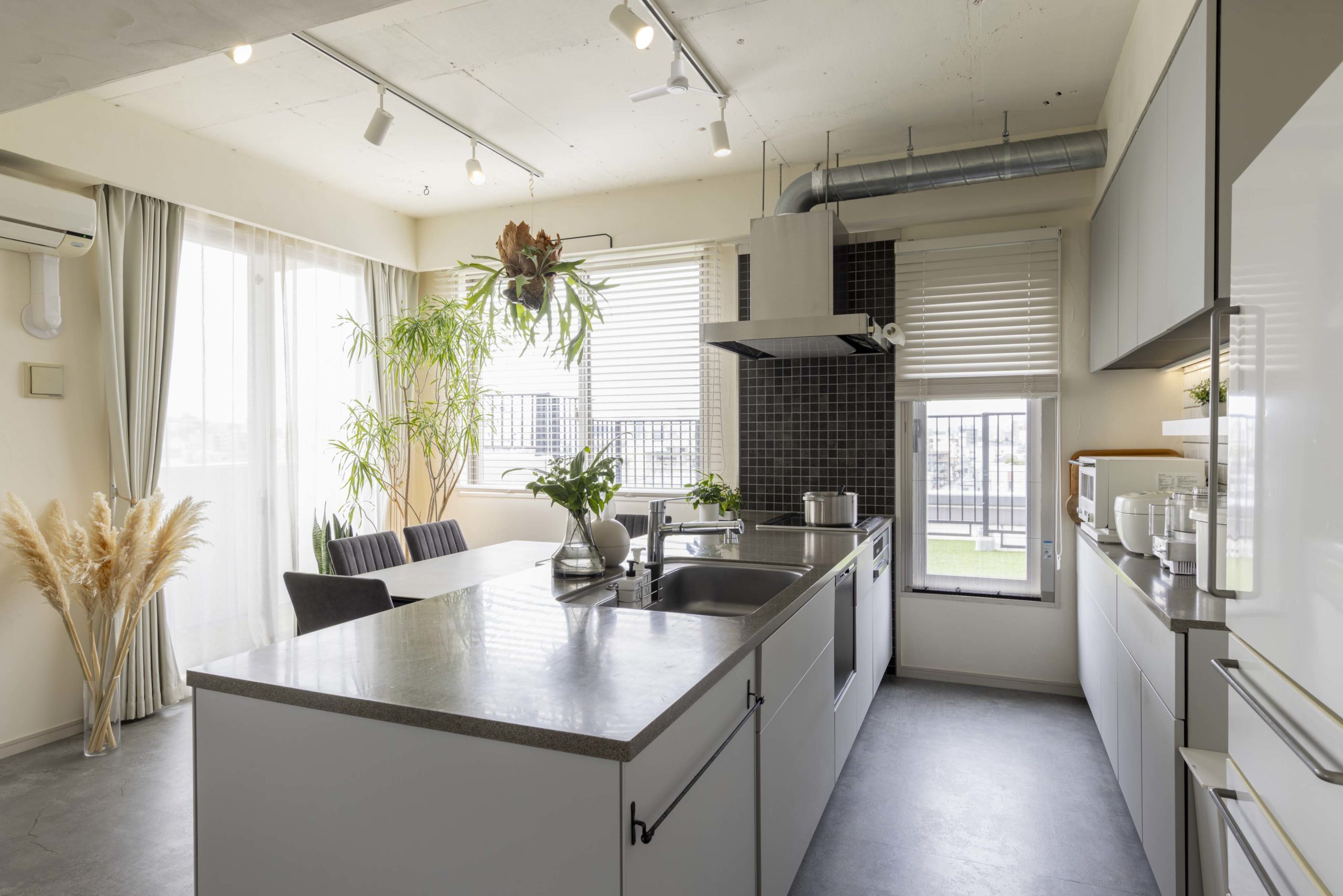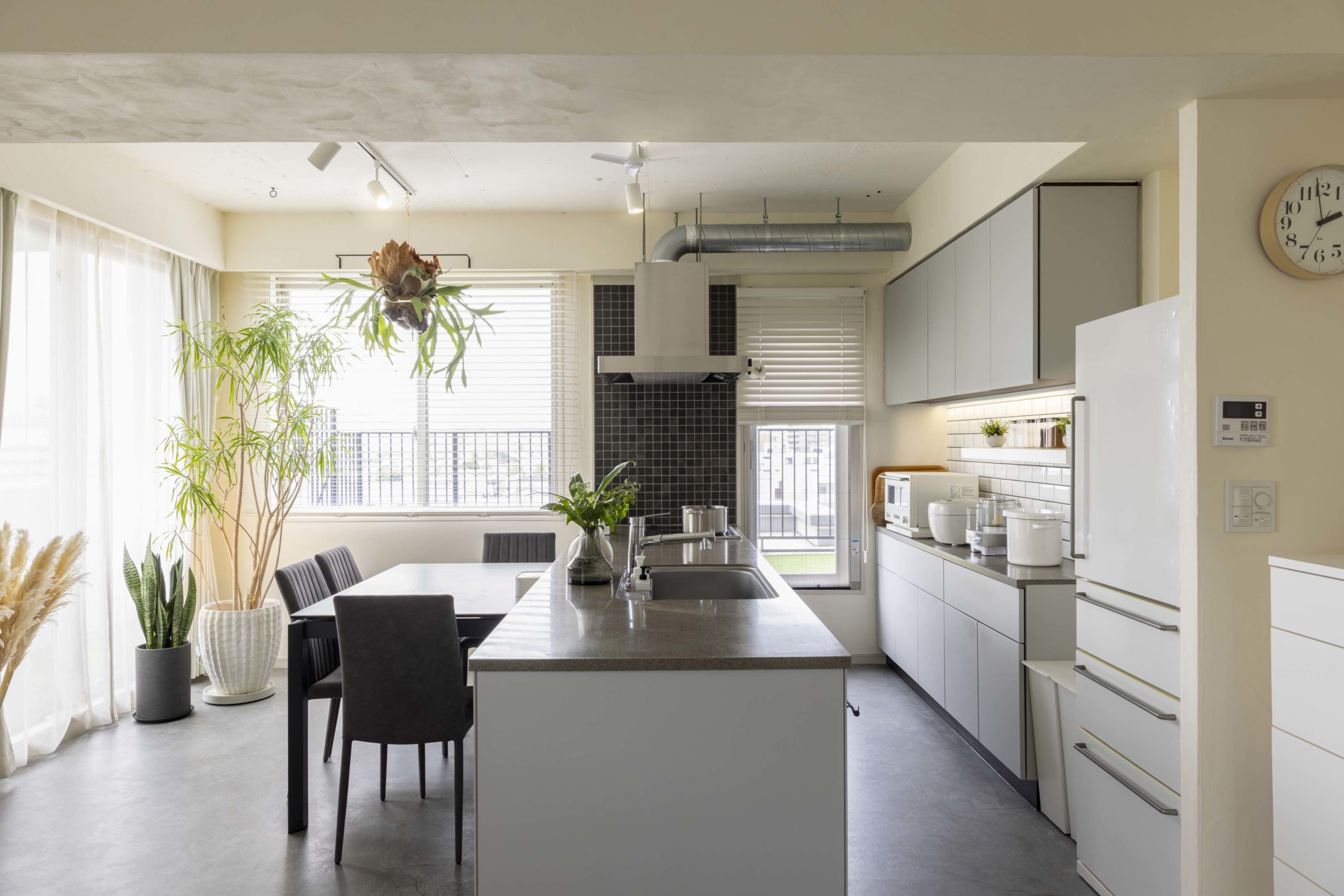 また、たくさんの植物を飾ってボタニカルなカフェのような雰囲気を演出し、天井の壁も壊してレンジフードの排気ダクトをあえてむき出しにすることで、奥様のご希望のカフェ風のインダストリアルなアクセントも加わりました。